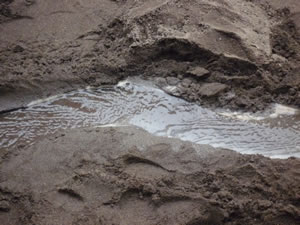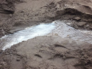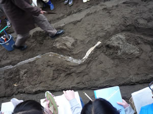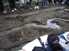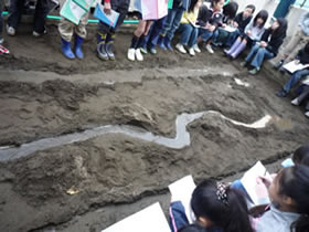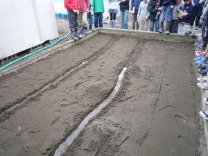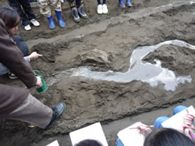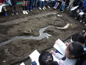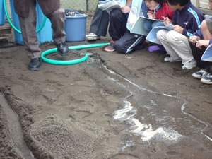 講師が建設省土木研究所(現:独立行政法人土木研究所)での勤務経験があり、河川実験のスペシャリストであったため、実験は非常に的確に、また児童にわかりやすく実施できた。 運ばれる土砂はよく再現されおり、水を流した後の川底の土砂の観察時もポイントを指摘してもらえ、児童の理解はより深まったようだった。 児童は掘削、運搬、堆積の3つの働きについて自分の目で観察していた。 川の曲がりの外側の土砂は削られ、内側は堆積している様子を発見していた。 また、今回の実験はプールの水を利用し砂場で実験を行ったが、プールからポンプを利用するのではなく、水位の差を活用して実験現場まで水を引いて来たので、それだけでも児童は驚いたようだった。