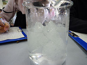 - ビーカーに氷を入れ、お湯を注ぐ。